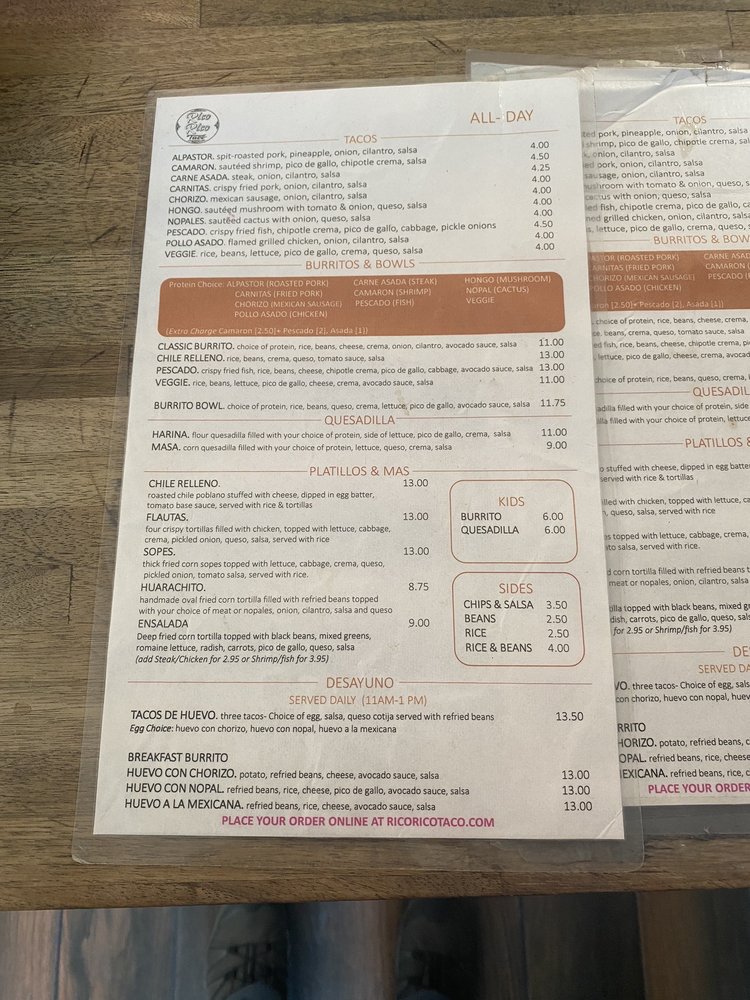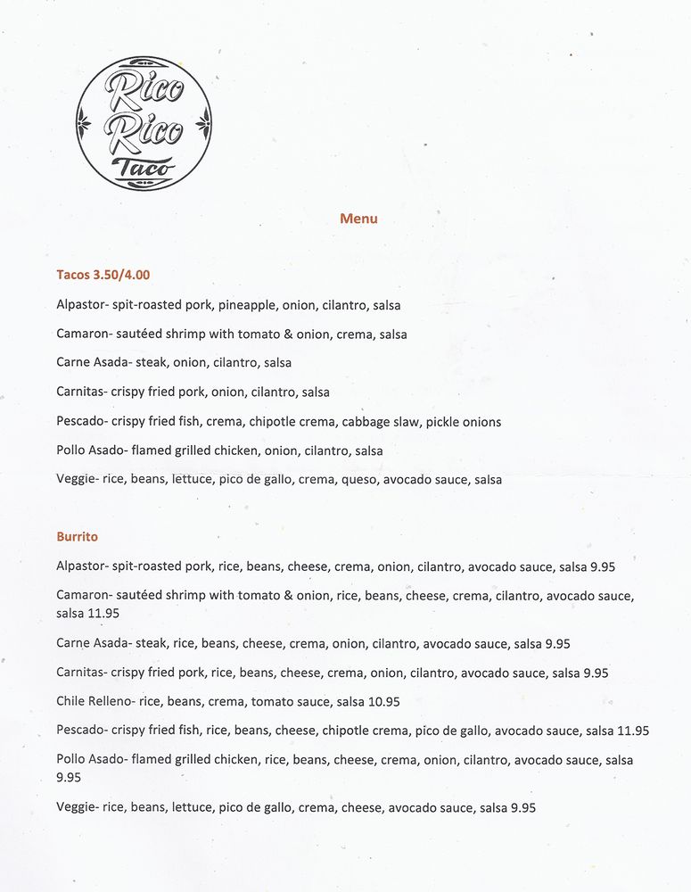 “ We wanted burritos. Good burritos. We are a family that loves burritos. We came upon Rico Rico by chance, I ordered online and my husband picked up on his way home. I think it may have been for me, the best burrito I've had. Ever. We got two pollo asado burritos and one carnitas. The chicken was plentiful, generous sized pieces perfectly cooked and seasoned. The avocado salsa was so delicious I wanted more!! The portion was generous and the price was very reasonable. My husbands carnitas was tender well cooked, and not fatty. The beans were amazing. Black beans were flavorful and tender. The Fritos beans were delicious. The tortillas were texturally amazing. Good clover tender with some tug when biting into it. Really really good. Like super good. They were ready quickly and piping hot when they got home. So I would say to go service at lunchtime was awesome! ”