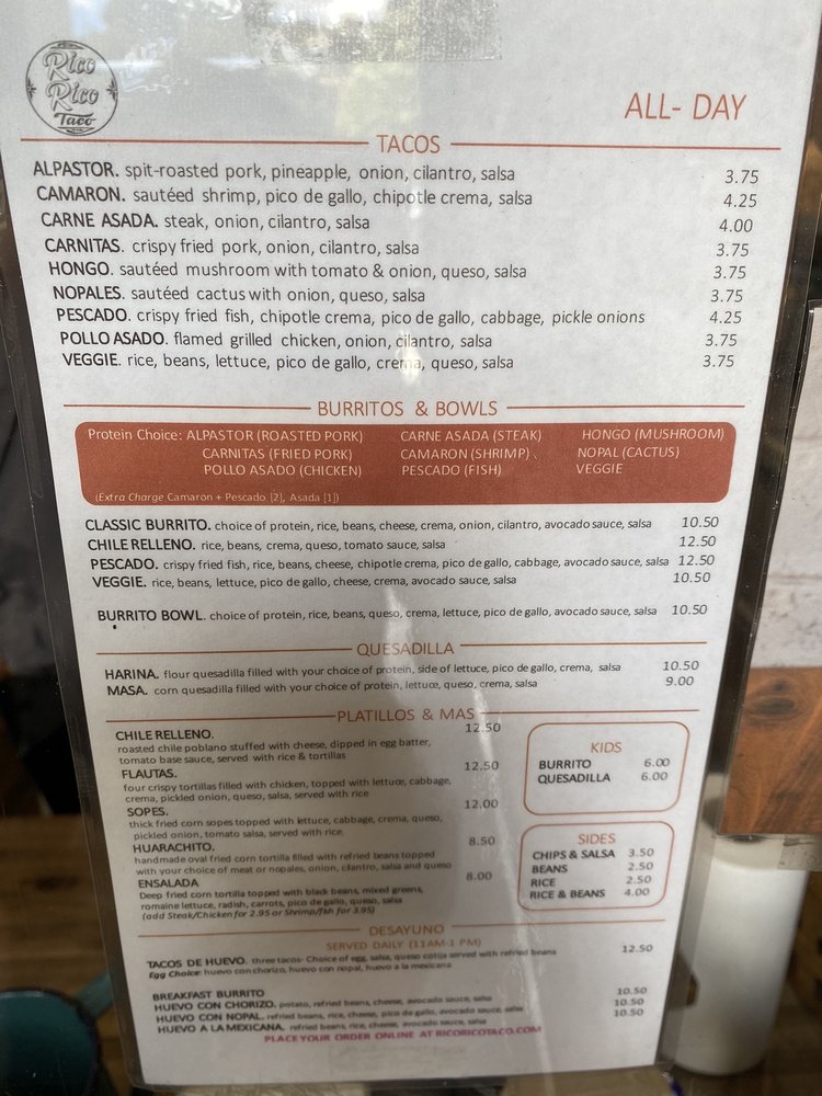 “ Previously I had ordered Rico Rico taco from Uber eats. Our burritos were mostly rice. Each of us grabbed 3 tacos. Asada, Al Pastor and Carnitas. I think the carnitas was the winner. Al pastor is pretty mild and had zero spice. No heat. All of the meats were tender. Habanero sauce was good but not on the same level as Maya Halal hot sauce. Radishes were great between tacos and the little pickled carrots were awesome. Overall a very enjoyable quick lunch. ”